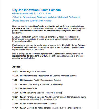 DayOne Innovation Summit Oviedo 06 de marzo de 2019 | 10.30h - 14.30h Palacio de Exposiciones y Congresos de Oviedo (Calatrava), Calle Arturo Álvarez Buylla s/n, 33005 Oviedo, Asturias Inscríbete: https://www.dayoneinnovationsummit.com/ES/Oviedo